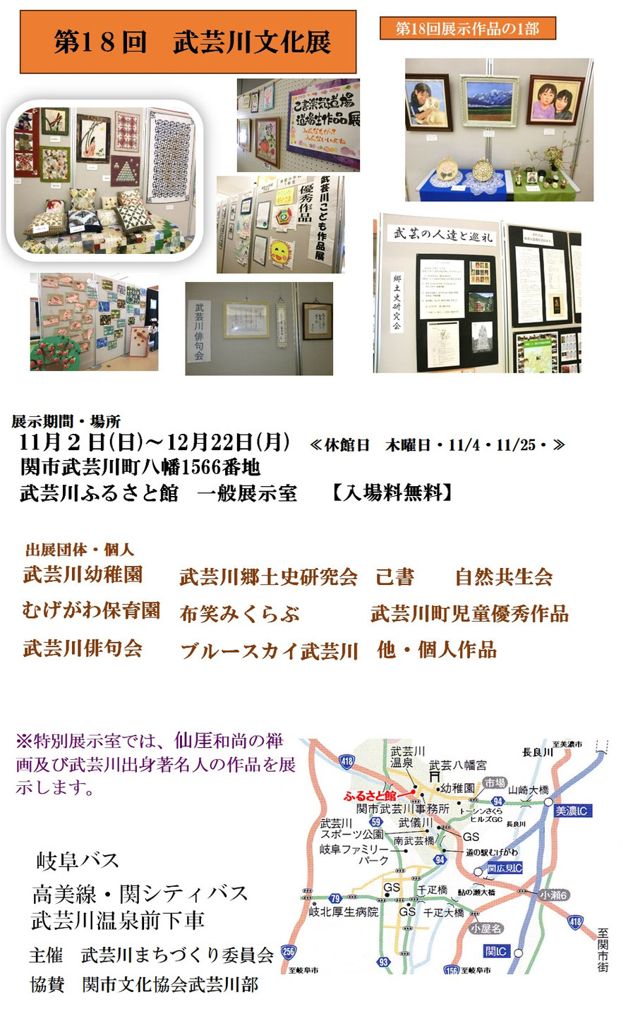 関市武芸川ふるさと館では、11月2日(日)から12月22日(月)まで「第18回 武芸川文化展」を開催します。